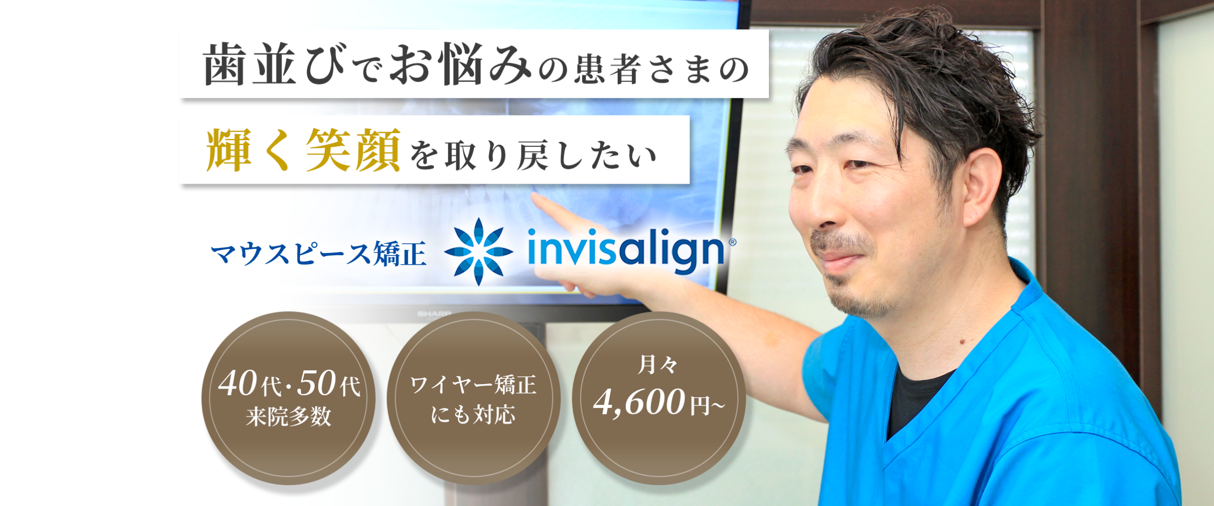 当院では、透明で目立たないマウスピース矯正インビザラインを、月々4,600円〜の低価格でご提供。