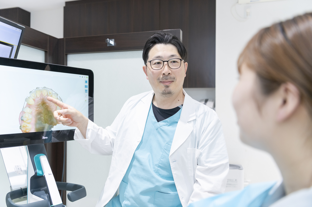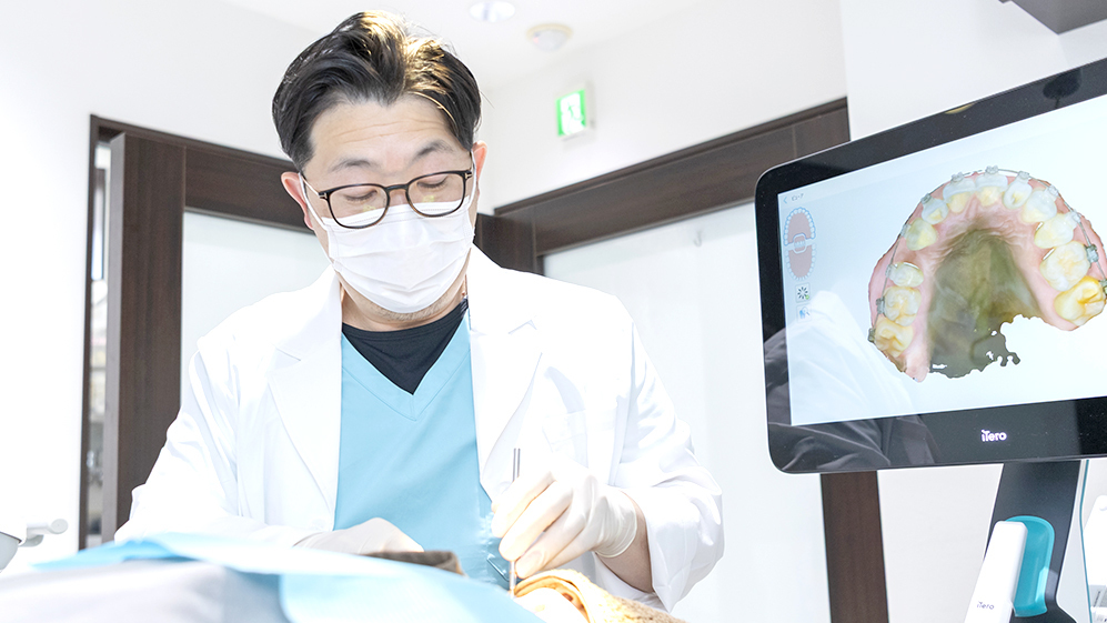 院長がお口の診察を行い、続いて最新の口腔内スキャナー「iTero(アイテロ)」を使って、患者さまの歯をスキャンします。